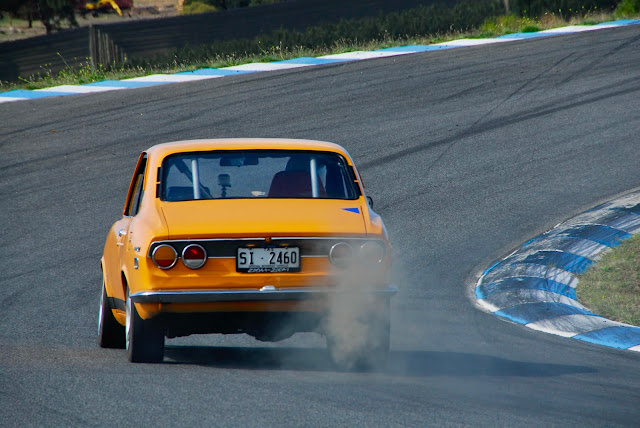 Geoff Storr in his Alfa GTV, Philip Sawers driving an XU1 Torana, Greg Hall at the controls of his Datsun 240Z and Bruce Heron piloting his trusty Triumph Dolomite all made it look easy, lapping consistently and smoothly. Angus Haydon, in a R31 Skyline, and Gary Lucas with his angry little Sprinter, both also looked to be on-song, as was the screaming yellow Suzuki driven by Darryl Bennett.