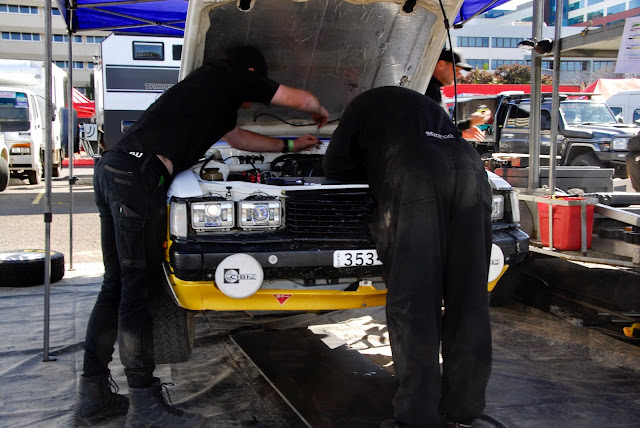 Having just dissed the newbies, this slightly worse for wear Ford Fiesta R5 gets a special dispensation for wearing Tasmanian rego plates - even if crew members Sean and Andy are from NSW and South Oz, respectively. The team's mechanics were impressive, stripping the car of its crumpled front end in very quick time whilst simultaneously seeing to its other needs.