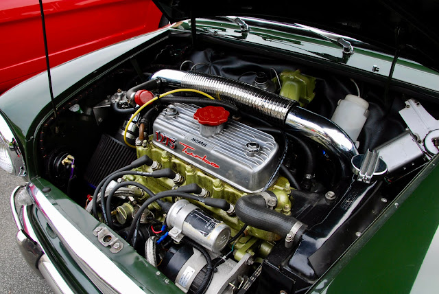 According the Mini's owner, the Metro turbo is more or less an A-series donk, in that its external dimensions and internal capacity mirror the original Morris and Austin 1275 cc powerplant, making for a relatively easy installation. However, there's some internal "webbing" that I take to be a form of structural reinforcement that caters for the considerable extra stresses that result from being force-fed. There's a bit of additional plumbing required, too, plus some further room required for the snail, but this has all been beautifully resolved in this car. The single SU had to be reconfigured to operate under pressure rather than by vacuum but that's beyond my capacity to explain adequately, although it's clear that the owner understood and was able to sort it very capably.