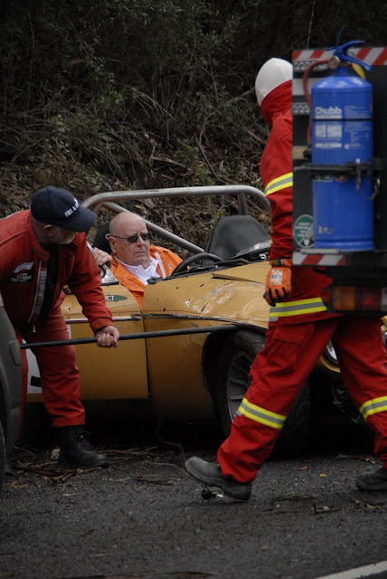 Unfortunately, the following two photos are the last we're likely we're to see of motor sport stalwart Herby Burgess' long-campaigned MGB for a while, as he fell victim to a slippery wet patch immediately after this bend and rolled the car. It was a tense moment for officials and spectators alike but, fortunately, Herby emerged shaken but uninjured and talking up the benefits of roll-over protection. He was heard to say this wasn't the first time he'd skidded down the road wrong way up, so it's reasonable to suggest he knows what he's talking about!